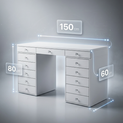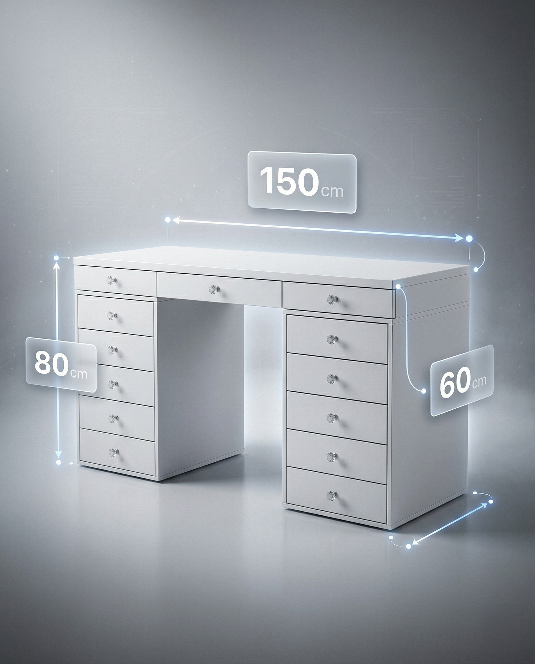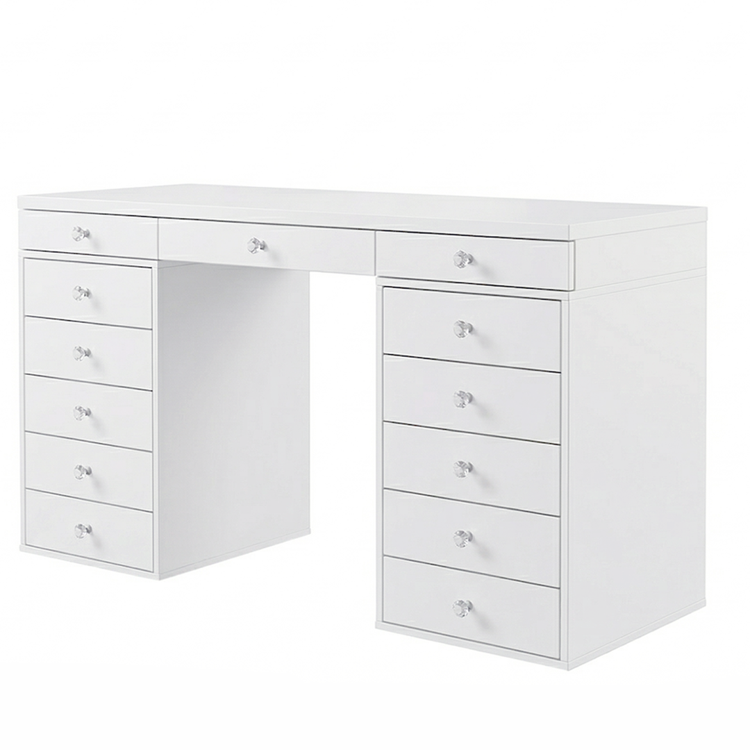 Dressing table with a mdf solid top, 3 centre drawers, and 5 drawers on each side, finished with elegant diamond handles for a stylish and organised setup.