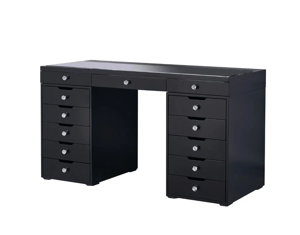 ✔ 1x Vanity Table with glass top, 13 drawers, and diamond handles.