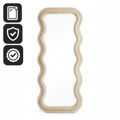 This 170 × 70 cm mirror features a softly curved design that brings a calm, modern presence to any space. The frame is made from high-quality MDF, providing durability and structural strength, and is finished in a light beige velvet fabric for a subtle, refined look.
