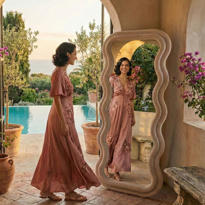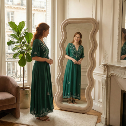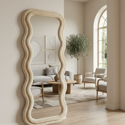 The neutral tone and smooth curves make it easy to style in bedrooms, dressing areas, or living spaces. Designed as a full-length mirror, it offers both everyday practicality and understated elegance.