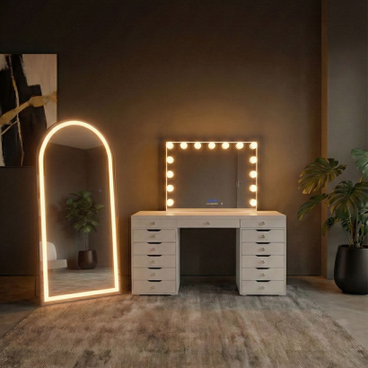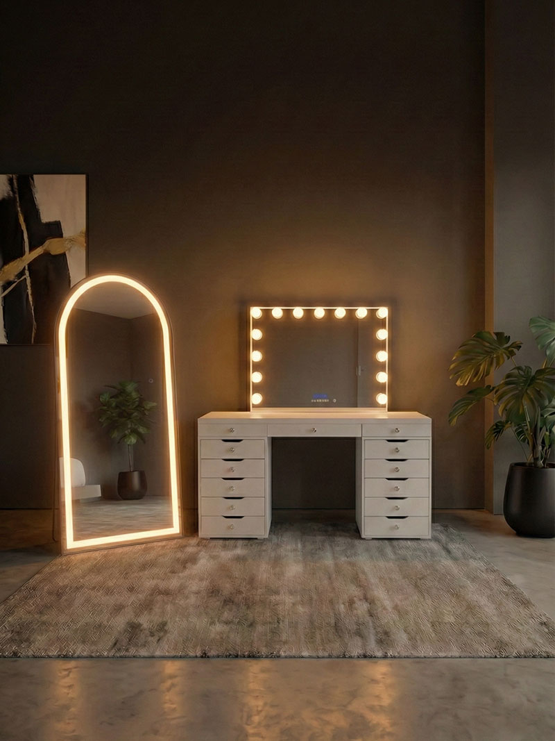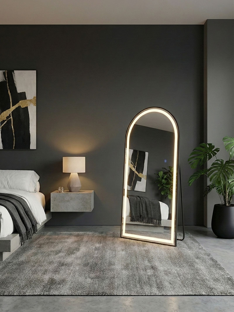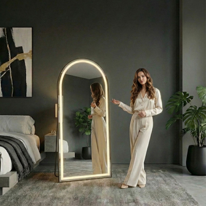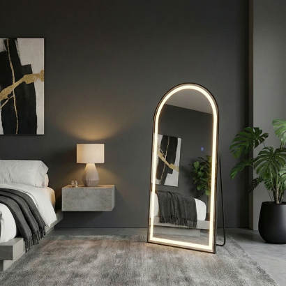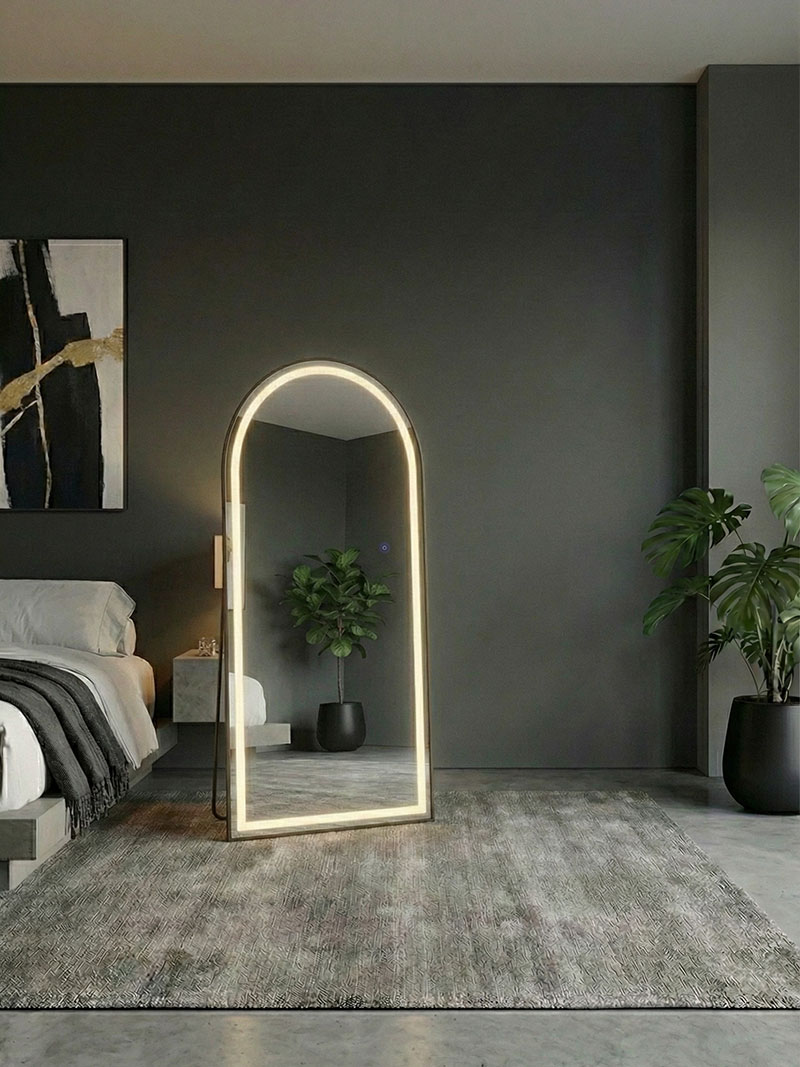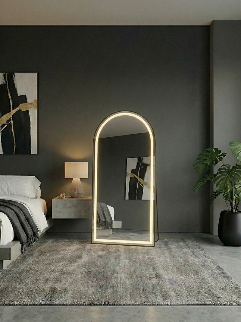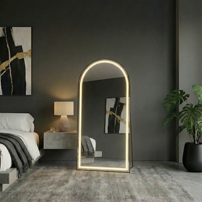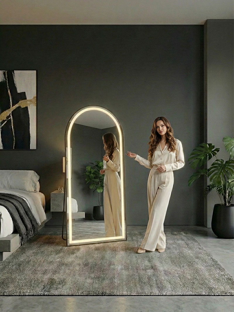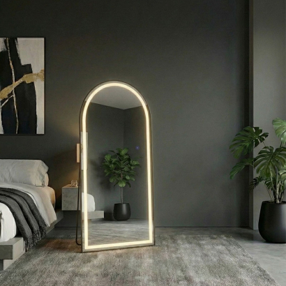 The Norvina LED Standing Mirror is a luxury full-length floor mirror designed to elevate modern interiors. Featuring an elegant arched top and a sleek black aluminium frame, this mirror measures 170 × 70 cm and offers a clear, full-body reflection. High-density integrated LED strip lighting provides smooth, even illumination, enhancing both function and ambience. With a built-in rear stand, the mirror can be placed freely anywhere or leaned against a wall, giving you complete flexibility without the need for wall support. Ideal for bedrooms, dressing areas, and contemporary spaces, Norvina delivers a refined, premium finish with timeless appeal.