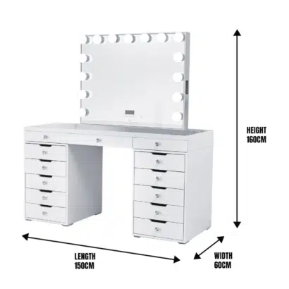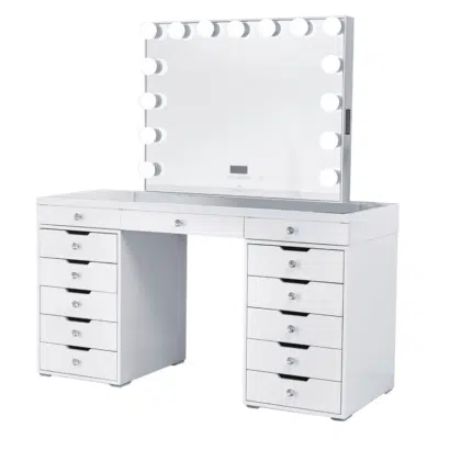 Upgrade your beauty space with the Hollywood Vanity Set with Makeup Mirror, a luxurious and practical addition to any makeup station. Featuring a sleek clear glass top, 13 spacious drawers with diamond handles, and a frameless Hollywood mirror with dimmable LED lights and Bluetooth speakers, this vanity is designed for makeup enthusiasts, beauty professionals, and anyone who desires elegance and organization in their beauty routine.
