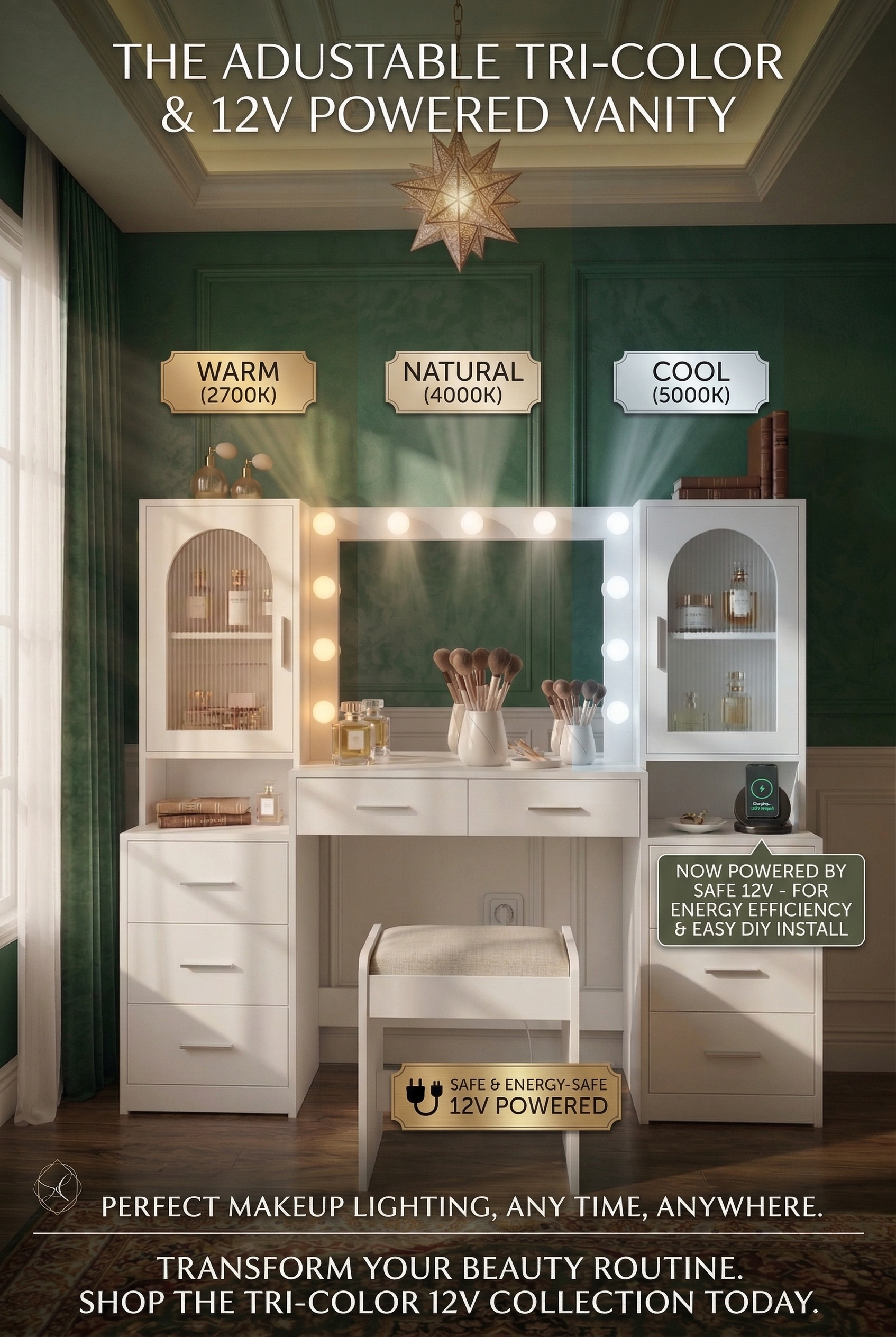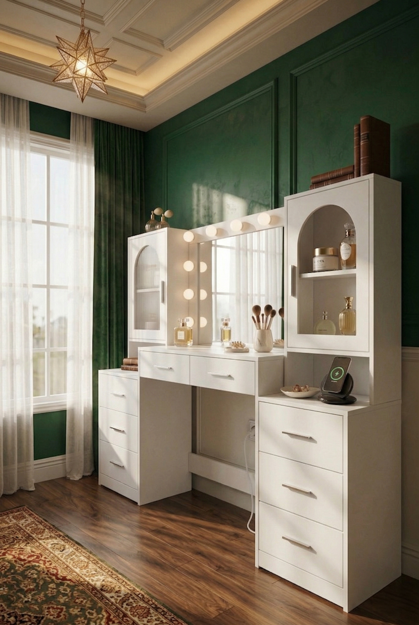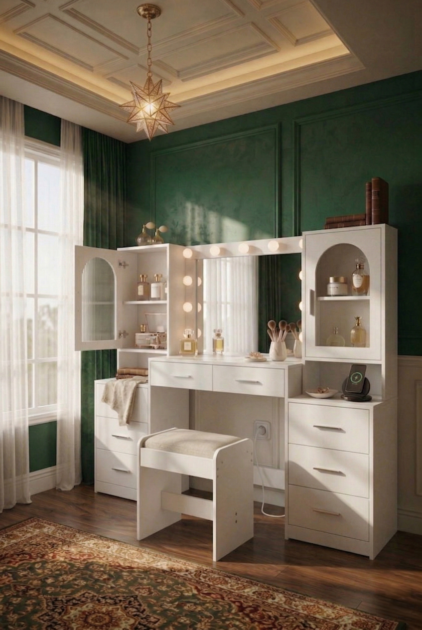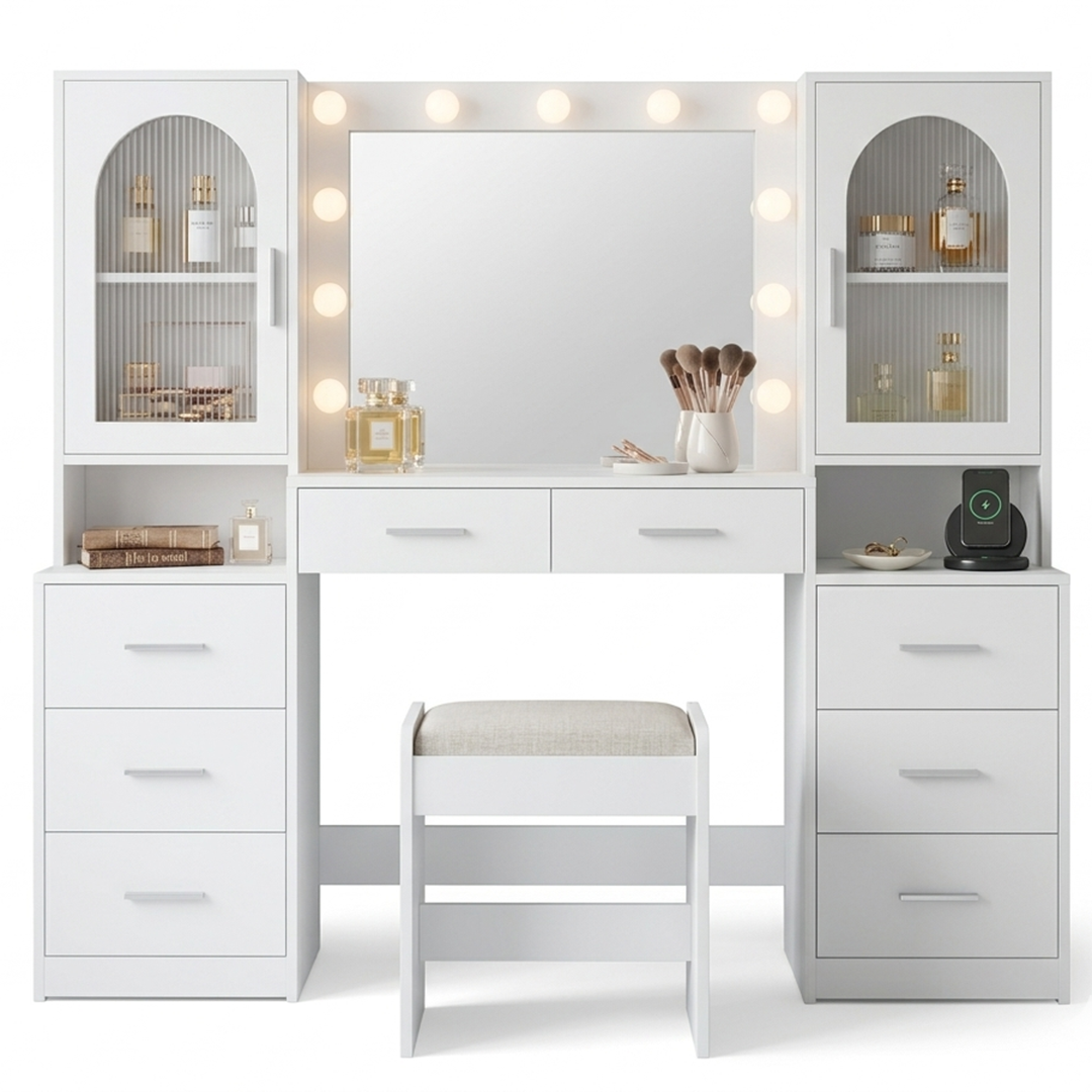 A modern white vanity designed for both style and functionality. Featuring adjustable LED lighting, ample storage with 8 drawers and translucent cabinets, and a built-in charging station, this vanity keeps your beauty space organised, bright, and effortlessly elegant.