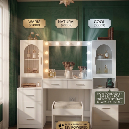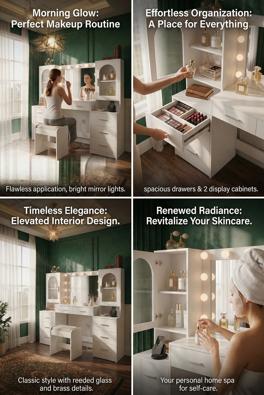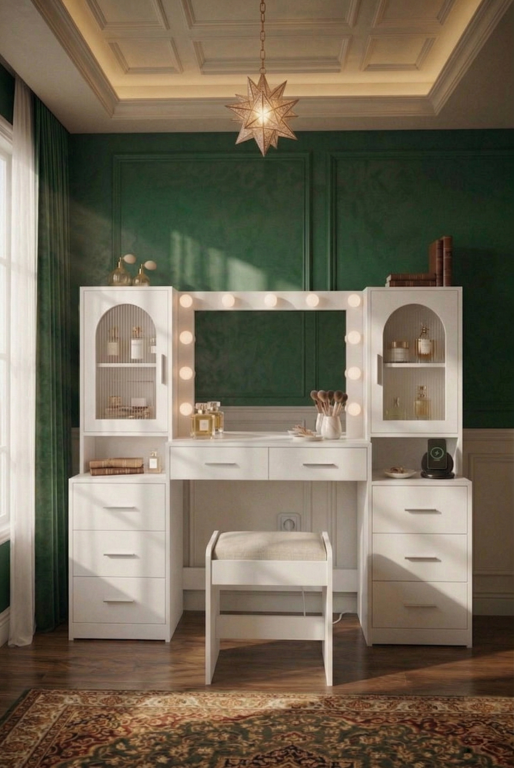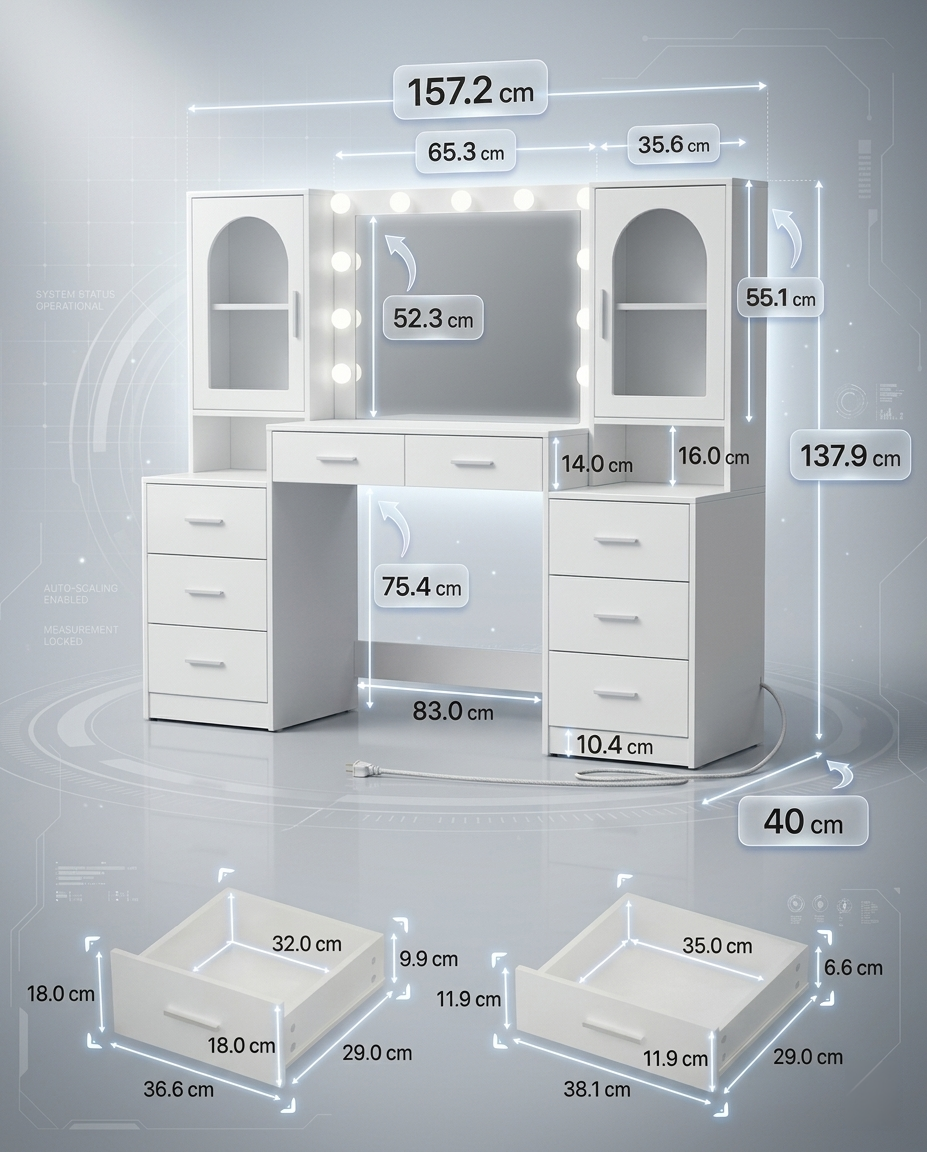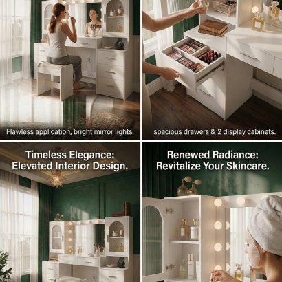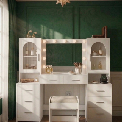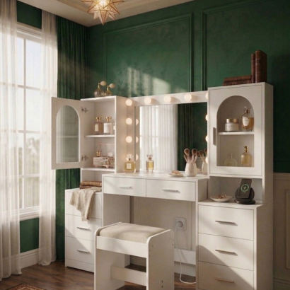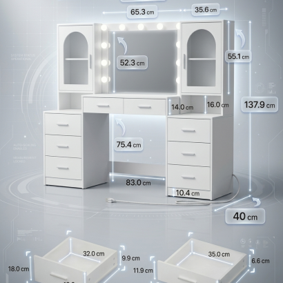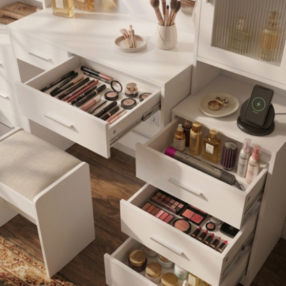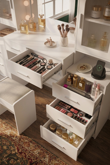 The vanity features 8 spacious drawers, 2 translucent cabinets, and open shelving, allowing you to organise makeup, skincare, and accessories neatly while keeping essentials within easy reach. The acrylic fluted cabinet doors provide a stylish display while letting you quickly see your items.