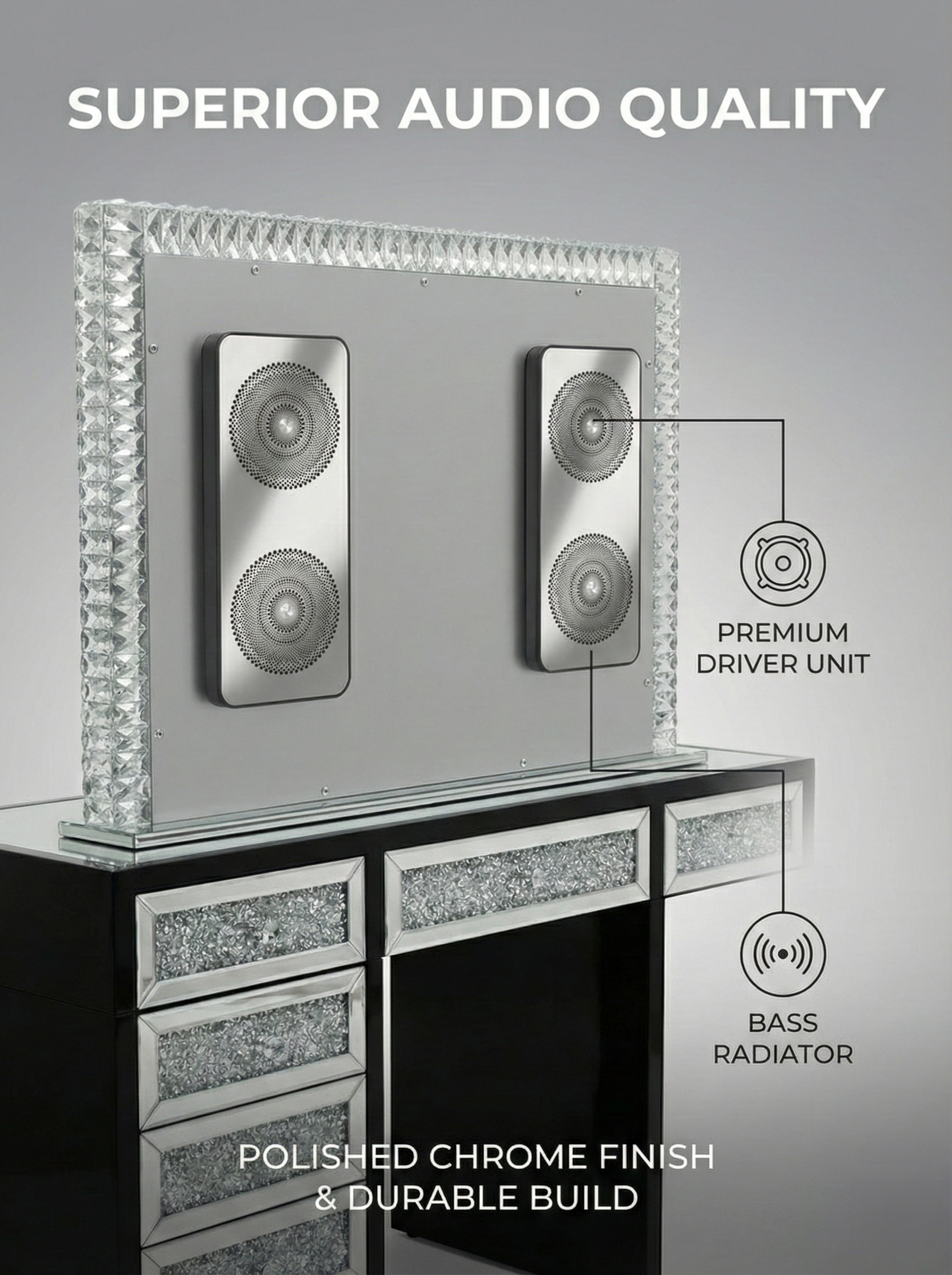 Luxury vanity set featuring a 120 × 80 cm diamond-edge LED mirror with tri-colour lighting, Bluetooth speakers, and smart time/date/temperature display. Includes a chrome-finished metal mirror with stand, and a crystal-detailed MDF vanity with clear glass top and push-to-open soft-close drawers.