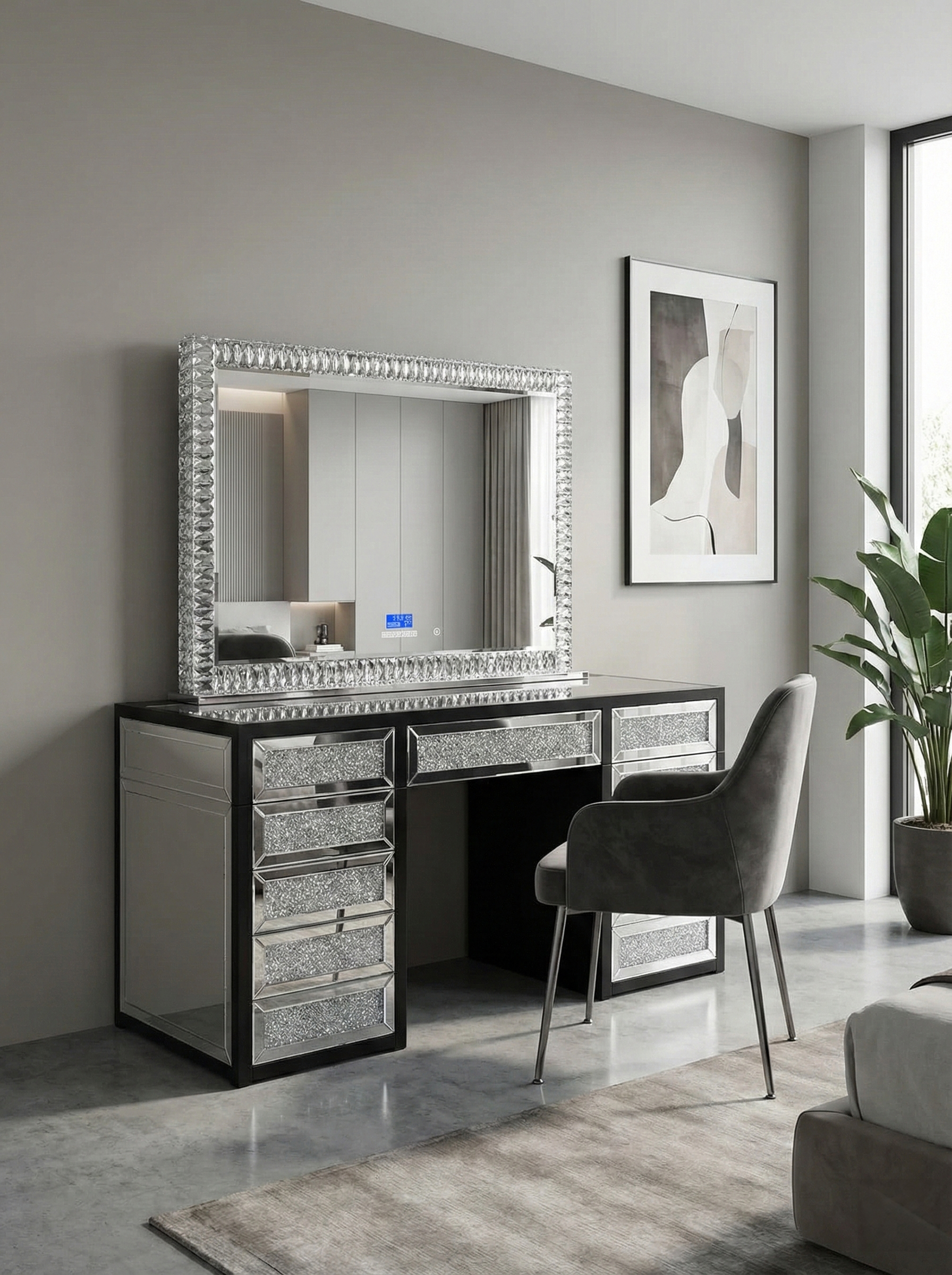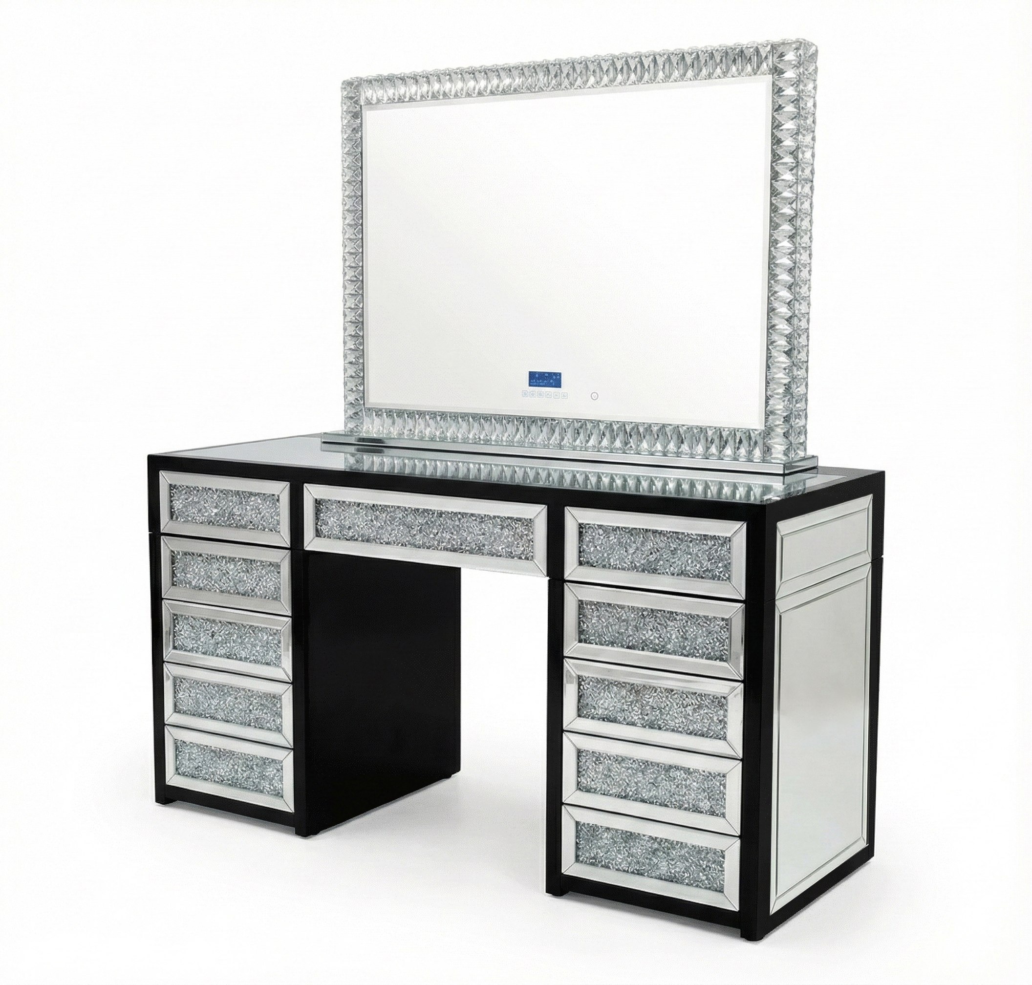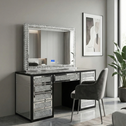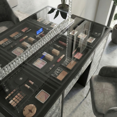 The vanity is crafted from strong MDF board and finished with crushed crystal drawer fronts surrounded by mirrored panels for a sleek, high-end look. A clear glass top adds a modern touch while allowing easy organisation and display. The drawers feature a push-to-open, soft-close system—push once to open, and gently push again to close and lock.